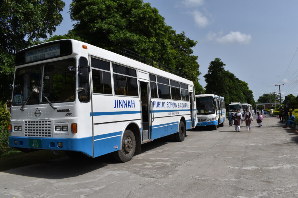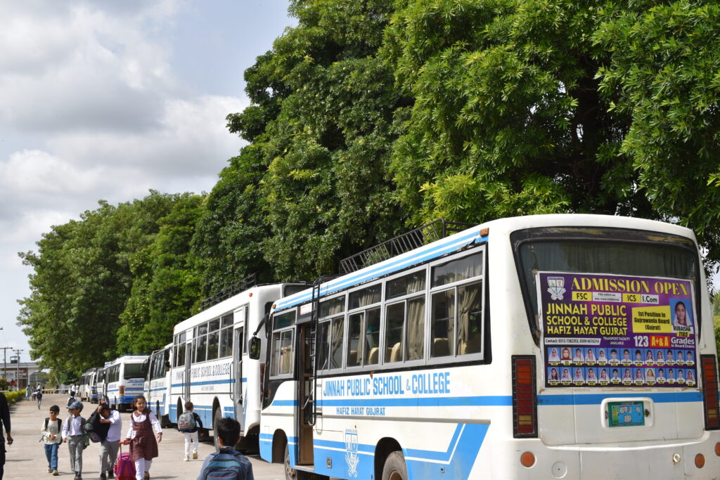 The school maintains a fleet of 24 well-maintained buses, ensuring a safe and reliable pick-and-drop service for all Jinnahites. This transportation network covers Gujrat, Jalal Pur Jattan, and surrounding villages, providing students with a comfortable and convenient travel experience to and from the campus.